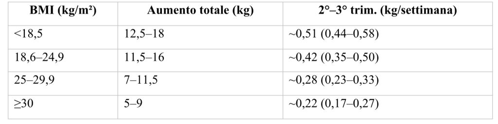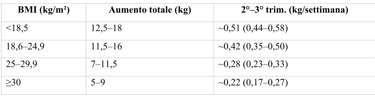 Linee guida aumento di peso in base al BMI pre-gravidico: